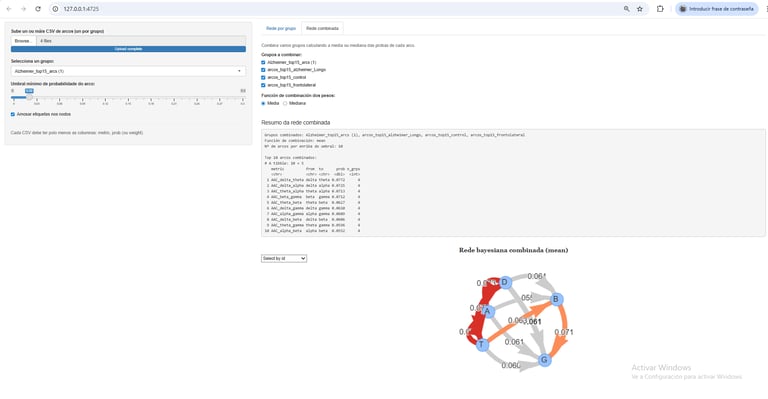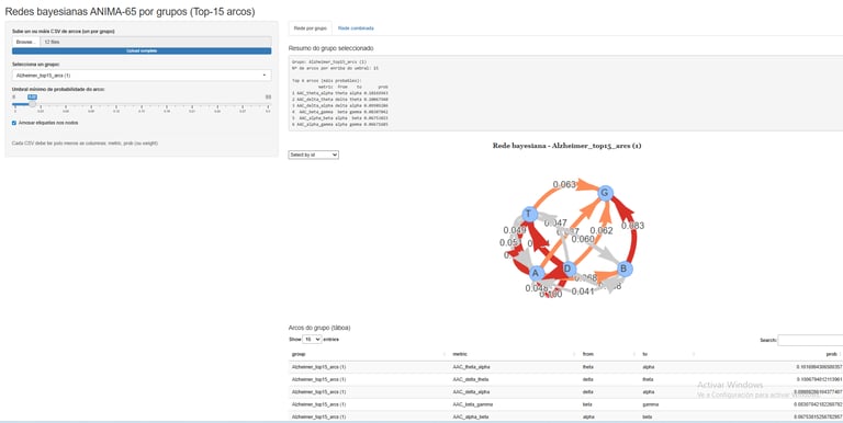 El usuario puede cargar uno o varios archivos CSV correspondientes a distintos grupos de estudio. Cada archivo contiene los 15 arcos más relevantes entre métricas oscilatorias (por ejemplo, delta→theta, theta→alpha, alpha→gamma…).