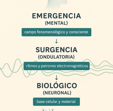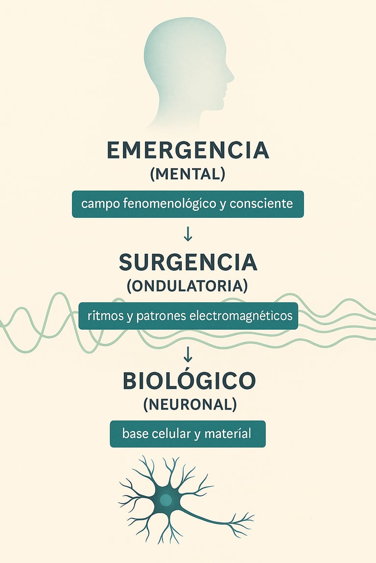 De este modo, la emergencia de la mente no puede entenderse como un fenómeno reducido únicamente a lo biológico ni únicamente a lo físico-ondulatorio. Se trata de un tercer nivel de realidad emergente, donde los dos sustratos —biológico y ondulatorio— se entrelazan en una dinámica inédita. La mente surge así como un campo fenomenológico que integra la materialidad neuronal y la vibración electromagnética, en un pliegue de naturaleza doble: